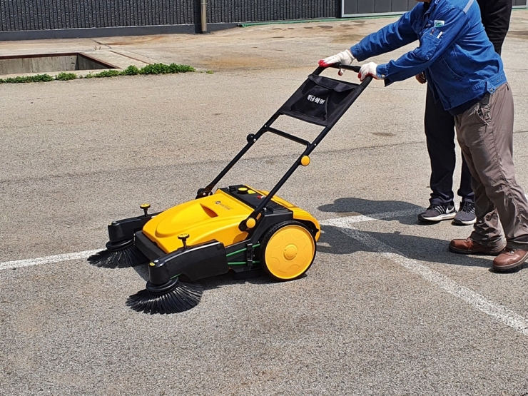 마당쇠950은 무동력 방식으로 작동하는 보행식 청소 장비입니다
