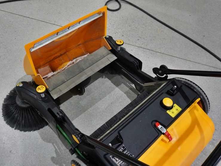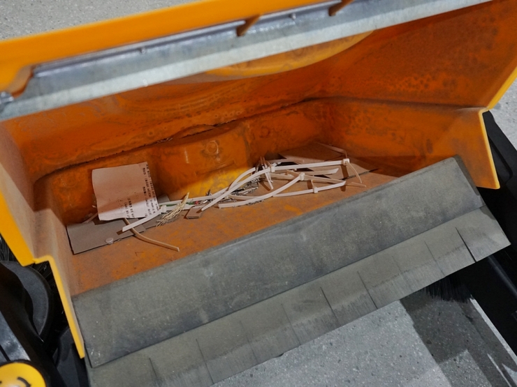 바퀴와 연결된 원통형 메인 브러시가 바닥의 먼지와 이물질을 회전하면서 쓸어담고, 이 모든 쓰레기들은 전면의 노란색 45L 호퍼통으로 모이게 됩니다. 전기나 연료가 전혀 필요 없는 구조임에도 성능은 탁월하죠.